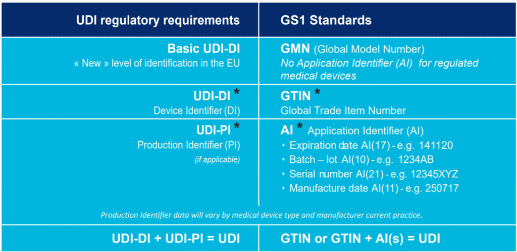 The GS1 system of standards provides a global framework to identify, capture and share Healthcare product information, thereby enabling a consistent worldwide implementation of UDI. UDI regulatory requirements have a translation into GS1 standards as shown in the table.