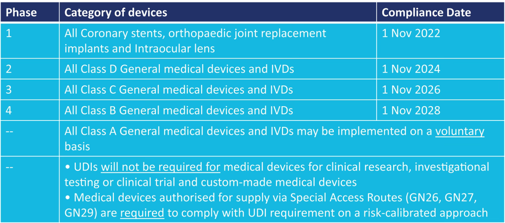 Medical devices that are supplied in Singapore after the respective compliance date based on the risk class, are required to comply with UDI requirement unless otherwise specified.